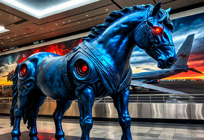空港の敷地に足を踏み入れた者がまず直面するのは、目を不気味な紅蓮の色に光らせた巨大な青い馬の像「ムスタング」である。