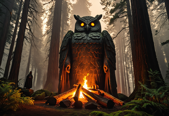 石のフクロウと沈黙の僧侶 : 高さ12メートルの巨大なフクロウの石像。その足元で、ローブを纏った参加者たちが松明を掲げ、棺桶に入った人形(日々の煩わしい心配事=ケアの象徴)を炎の中に投じ、焼き払う。これは、エリートたちが日常の社会的責任から一時的に解放されるための、心理的な通過儀礼である。