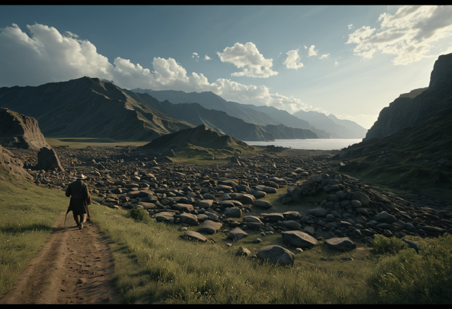 飛散する破片 :割れた石の破片は日本各地へと飛び散り、それぞれが各地の「殺生石」になったという。私たちが金槌を「玄翁」と呼ぶのは、この伝説的な破壊(あるいは救済)に由来している。