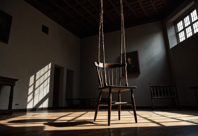 イギリス、ノース・ヨークシャー州の「サースク博物館」。そこには、世界で最も「物理的な座り心地」を拒絶する家具が展示されている。天井から太いロープで吊り下げられ、床から数フィート浮いた状態で固定された、一脚のオーク材の椅子。