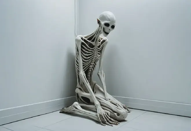 SCP-096は、身長約2.38メートル。不自然に細長い手足を持つ、色素の全くない白い皮膚の人型生物です。