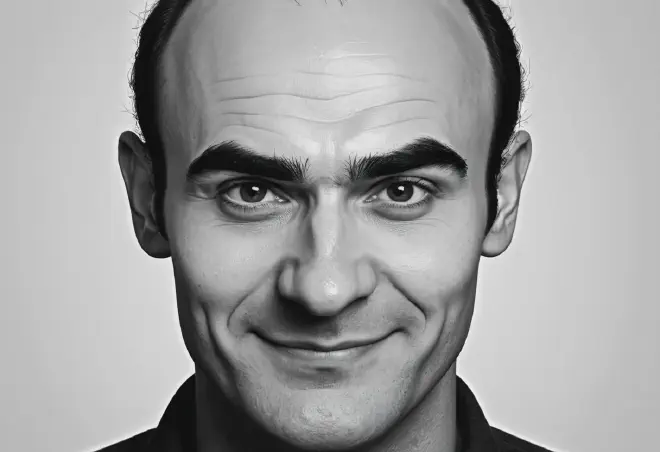 その顔は、繋がった太い一本眉、後退した生え際、そして何とも形容しがたい不気味な薄ら笑いを浮かべた、極めて特徴的なものでした。