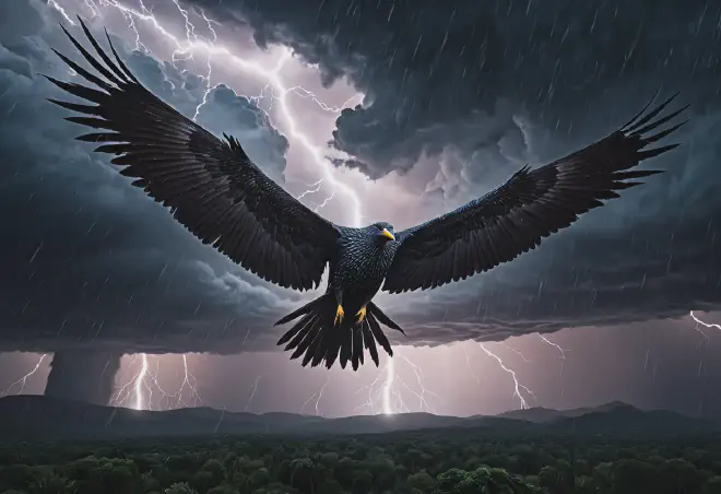 In indigenous traditions, the Thunderbird is often depicted as a guardian who maintains the balance of the world. *The Wings of Thunder : His wingbeats create the sound of thunder, and he carries a massive lake on his back, from which the life-giving rains fall. *The Eternal Enemy : The Thunderbird is locked in an eternal battle with the malevolent Underwater Panthers or Horned Serpents. He strikes them with lightning whenever they attempt to invade the surface world, maintaining the cosmic order.
