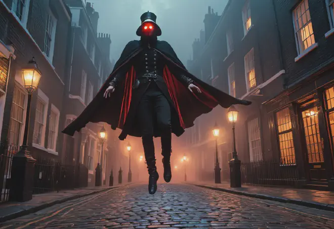 The first major attack attributed to Jack involved a young girl named Mary Stevens. *Morphology of Terror : Witnesses described Jack as wearing a tight-fitting oilskin suit with a high collar. He wore a mask or helmet that sometimes had horns, and his eyes were said to glow like “red embers.” Most famously, he was reported to spit “blue and white flames” from his mouth, blinding and paralyzing his victims. *Impossible Gravity : His name came from his signature jumping ability. When cornered by police or citizens, he would simply leap over buildings or high fences, disappearing into the night with a terrifying, high-pitched laugh.