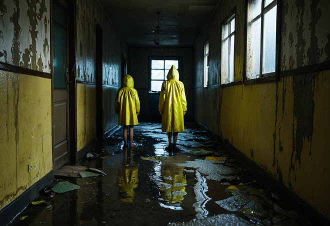The film takes place in an aging, damp apartment complex where even the elevator feels like an ancient, unreliable heart. *Isolated Parents : Yoshimi, a mother in the midst of a divorce, and her young daughter, Ikuko, seek refuge in this building. But their new home is a site of “Living Decay”—a place defined by the sound of leaking pipes and the presence of an ominous, monolithic water tank on the roof. *The Fraying of the Everyday : A stain on the ceiling that won’t stop growing. A clogged drain. A child’s red bag that keeps returning even after being thrown away. These minor domestic irritations act as a slow-acting poison, creeping into the viewer’s subconscious and signaling an irreversible shift in reality.