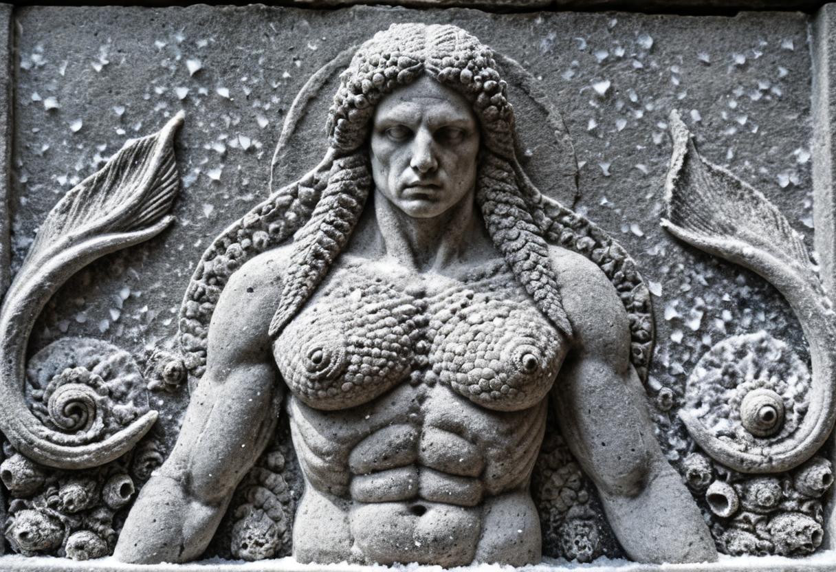 豊穣の神から偶像へ :本来は「穀物(dagan)」の神であったが、ヘブライ語で「魚(dag)」と音が似ていたことから、次第に半人半魚の姿で想像されるようになった。