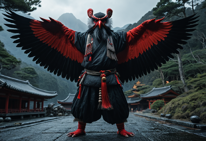日本の山々には、二つの「王」が存在する。一つは力で地上を支配する「鬼」であり、もう一つは知性と神通力で空を領する 天狗(てんぐ) である。