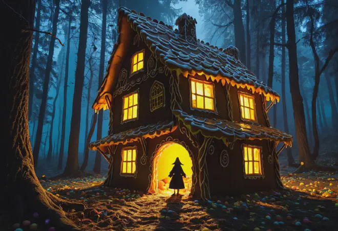 飢餓の極限状態に置かれた子供たちの目に、森の中の家が「お菓子」として見えるという描写は、非常に残酷な示唆を含んでいます。 *甘美な罠 : 魔女は子供たちを「肥えさせてから食べる」ために、最高の食事を与えます。これは、生存への恐怖を一時的に忘れさせ、警戒心を奪うための「餌」に他なりません。 *死の入り口 : ある解釈によれば、お菓子の家は極度の空腹状態が見せた「死の間際の幻覚」であり、実際には朽ち果てた墓所や廃屋であったとも言われています。