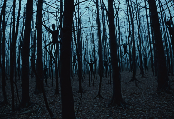 象徴:スティック・フィギュア :森のあちこちに吊るされた、小枝を組んで作られた不気味な形の人形。それは何者かがそこに存在すること、そしてその存在が「人間ではないロジック」で動いていることを無言で示している。