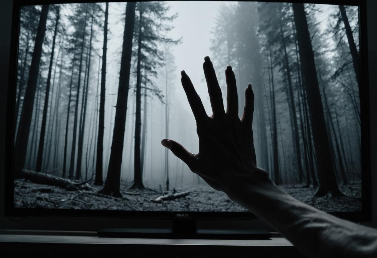 テレビ画面からの侵入 :情報の窓であったはずのテレビ画面が、異界と現世を繋ぐ門(ポータル)へと変貌する。物理的な距離を無視して迫り来るその存在は、もはや回避不可能な運命そのものである。